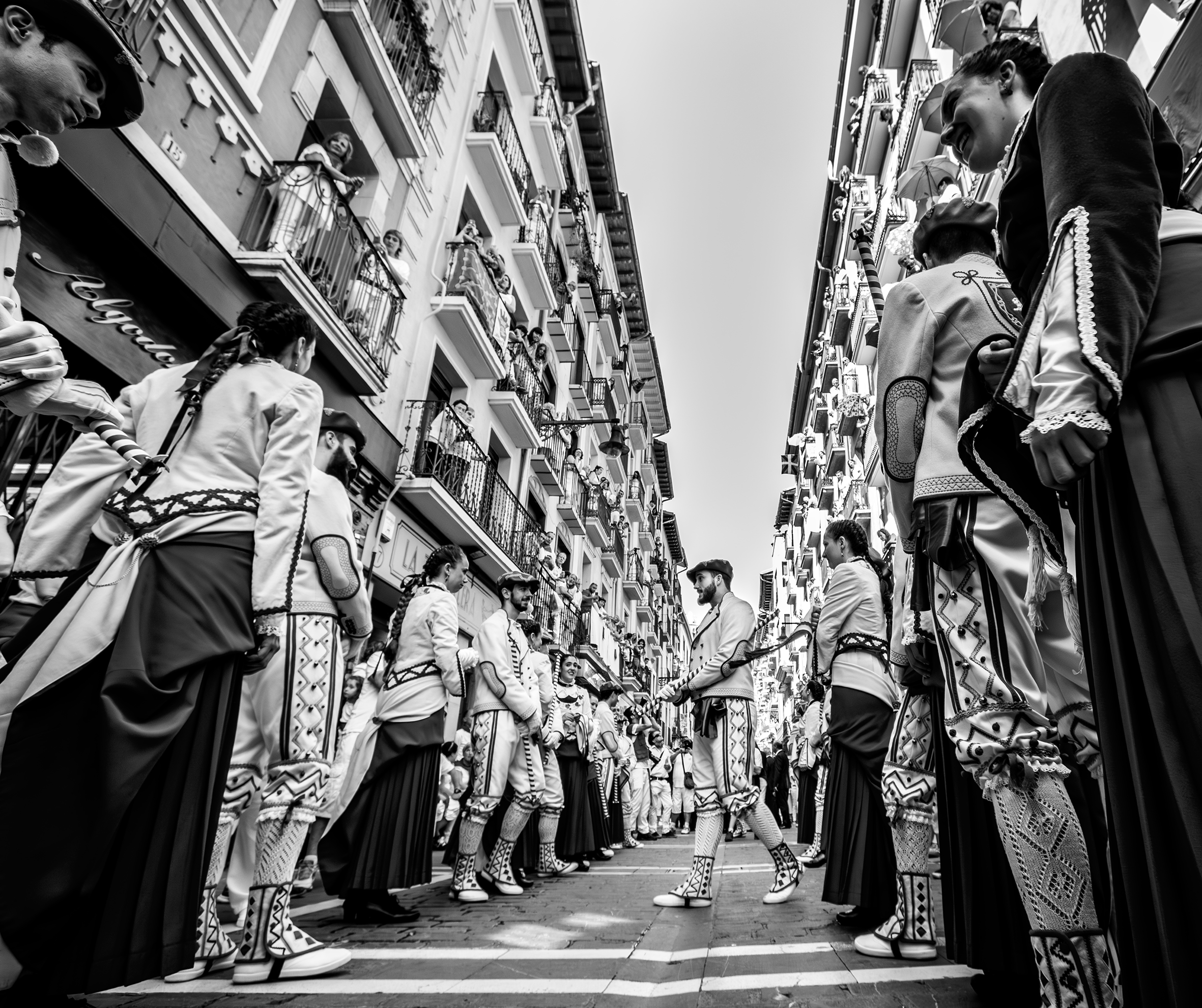 Entre líneas de edificios y dantzaris en línea, uno de ellos da un paso al frente.