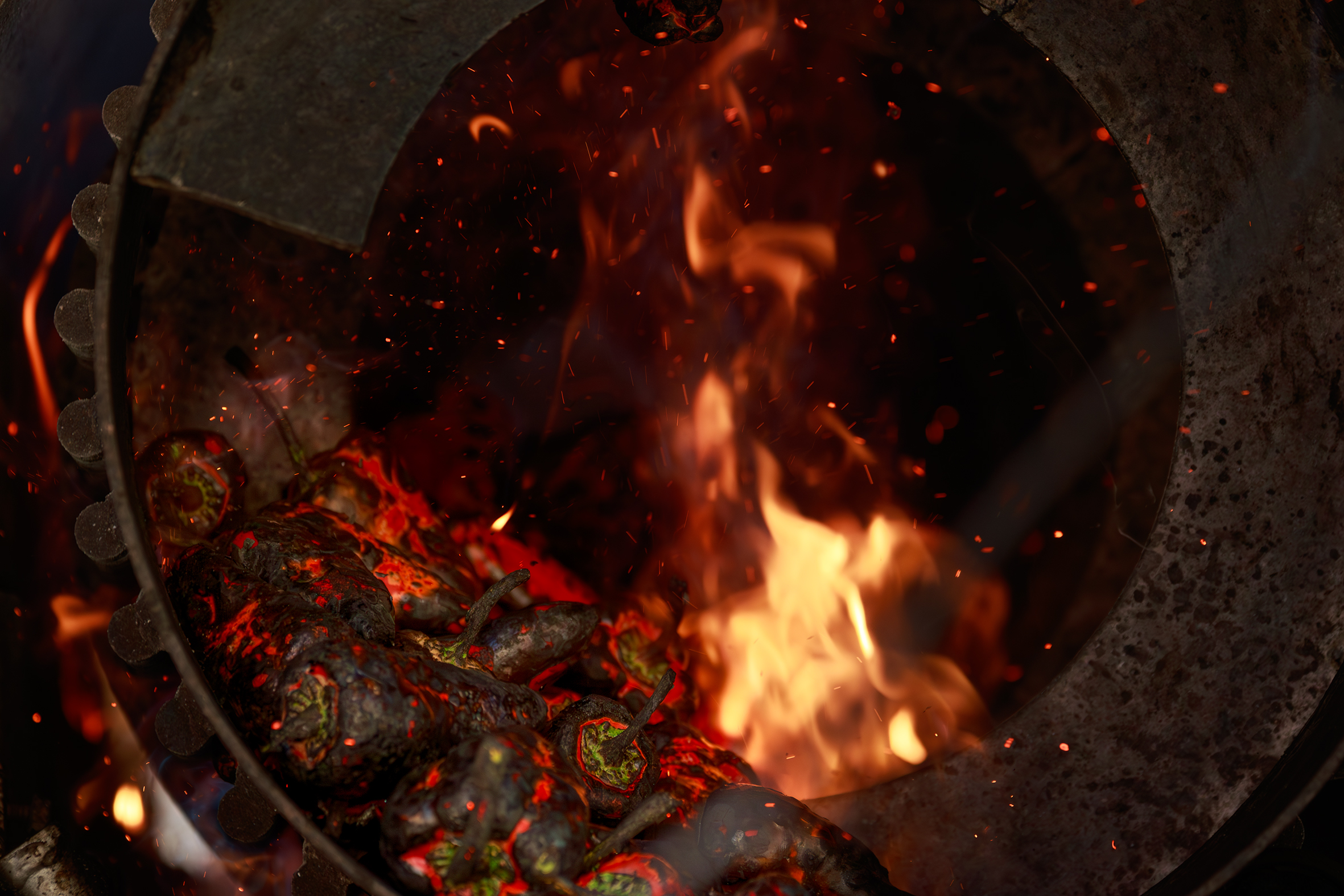 Después de la recolecta, pasan por el fuego, esos pimientos del piquillo salen del tambor cilíndrico, después de dar unas cuantas vueltas, bien asados en cuestión de unos minutos. Una vez listos, se pelan y se pueden conservar o congelar. Una mañana de septiembre en Puente la Reina.