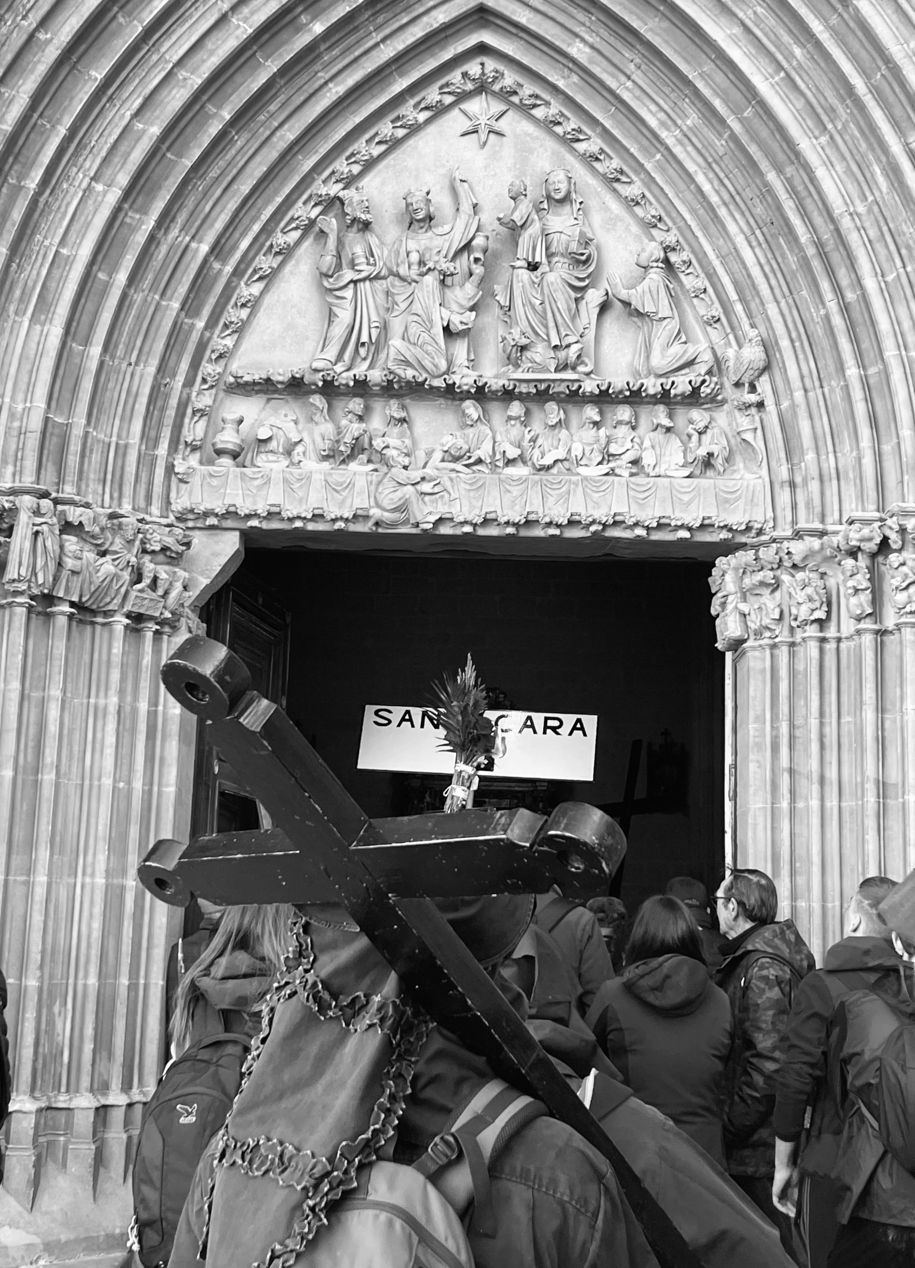 Entrada a la iglesia de Ujué tras la romería, momento en el que cada pueblo dedica una canción a la virgen y ofrece el camino realizado