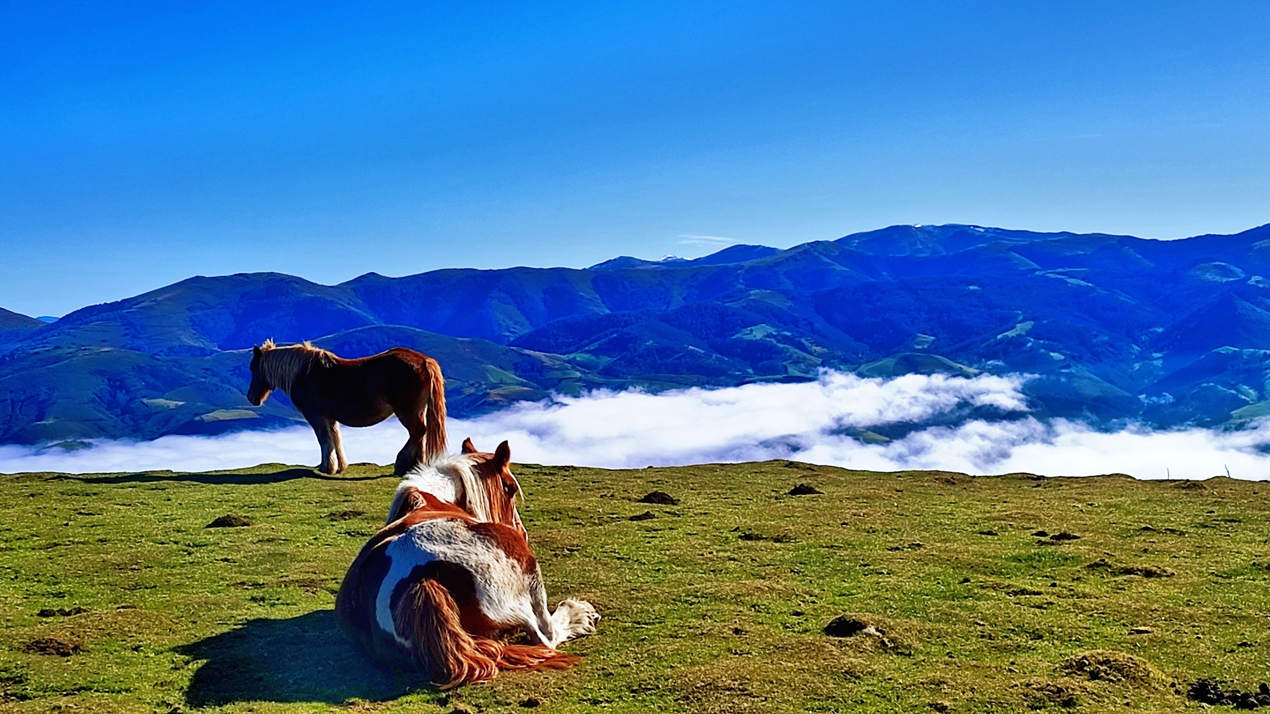 Disfrutando del paisaje Concurso: Paisajes y patrimonio https://concursos.diariodenavarra.es/conocer-navarra-2025/?p=25000 Caballos descansando en la subida a Peña Alba (Beartzun)
