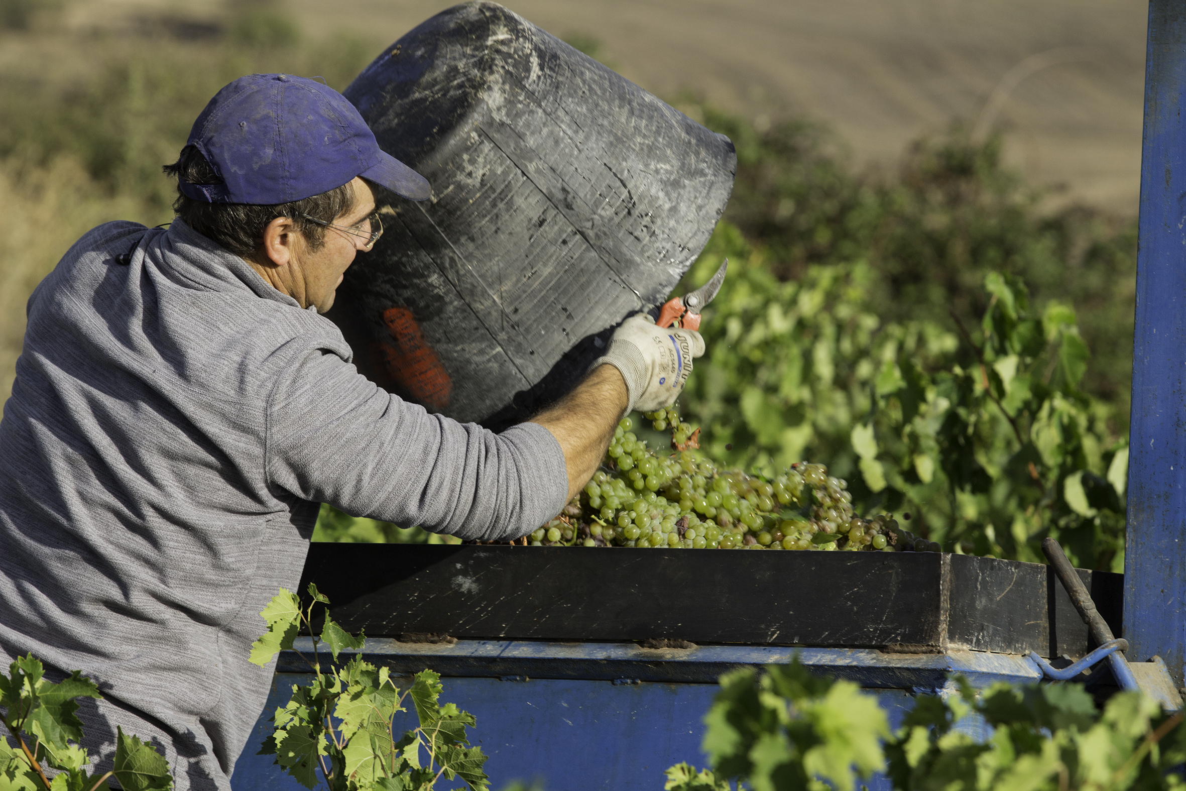 La vendimia manual con el cesto de goma descarga el agricultor al remolque del tractor