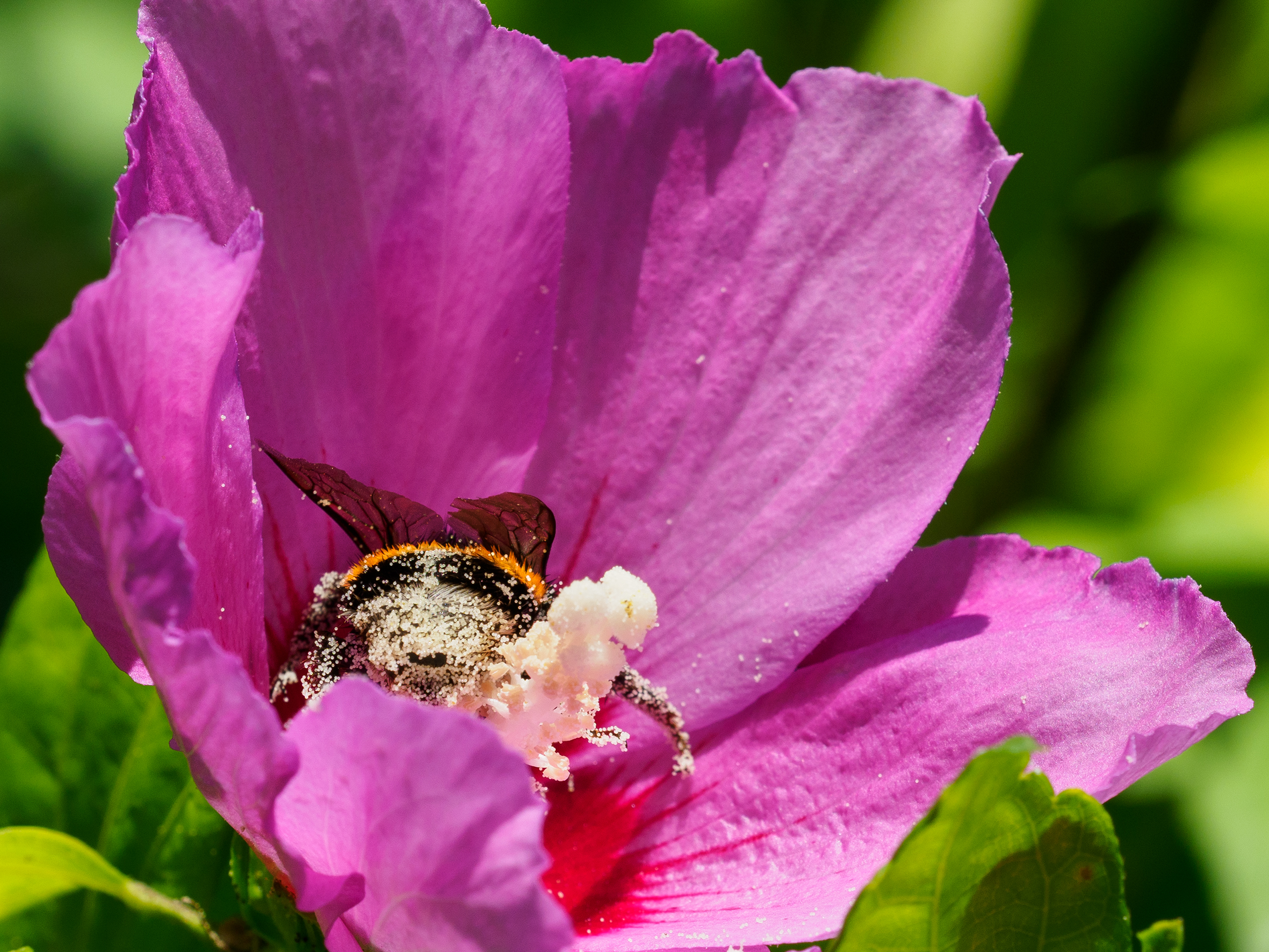 Abeja inmersa en su proceso de extracción de polen y néctar de una flor. Foto realizada en Lesaka.