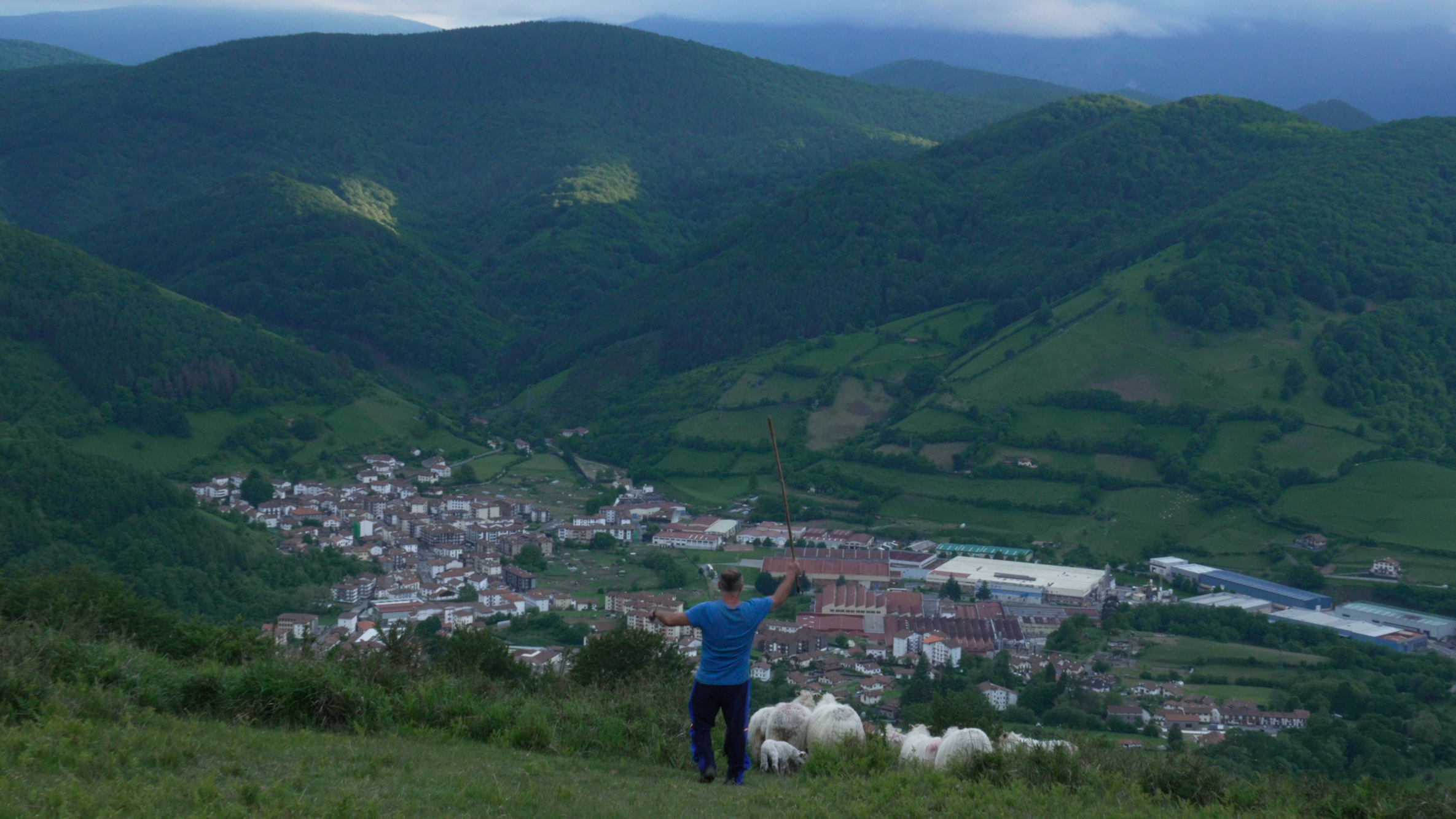 Un hombre levanta el palo con el que guía a las ovejas de vuelta al caserío. El valle deja al descubierto el pueblo de Leitza; pareciera que lidera al pueblo más que a las ovejas. Sin embargo, el hombre está sometido al dominio de la naturaleza, que se alza imponente sobre él, las ovejas y el pueblo. Curiosamente, los dos focos de luz que el sol proyecta sobre el monte, al otro lado del valle, hacen parecer que lo vigila y le recuerda su posición en el ciclo vital.