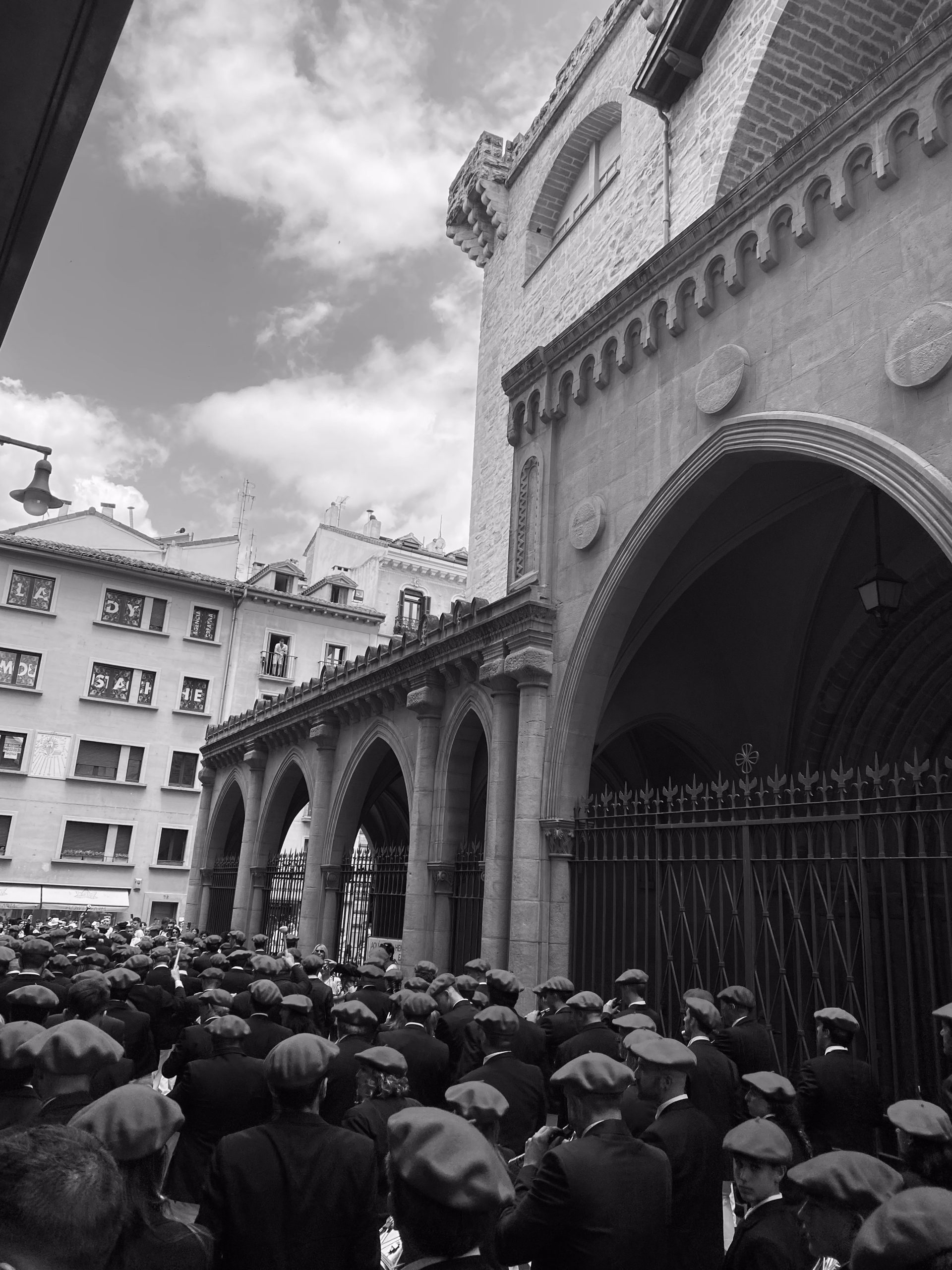 Comitiva de gaiteros desfilan por la calle San Miguel durante los Sanfermines.