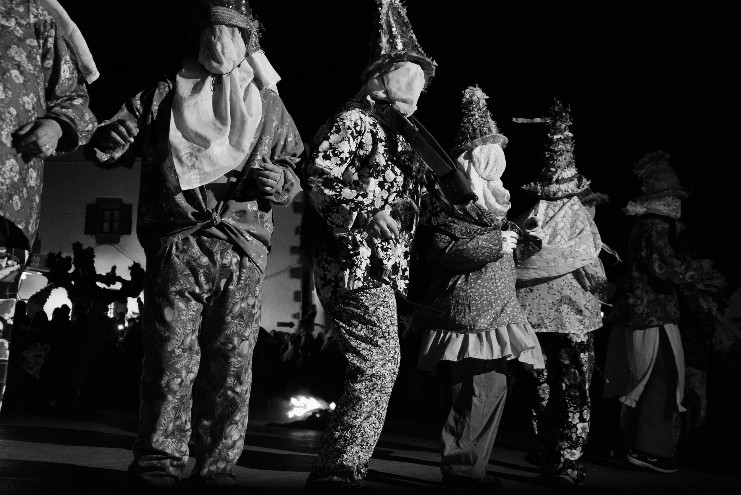 En el carnaval de Lantz, los txatxos emergen entre sombras y destellos de la hoguera, mientras la silueta de un caserío típico vigila desde el fondo. La fotografía en blanco y negro transforma un instante efímero en memoria atemporal, donde la luz, las texturas y los gestos revelan la intensidad de la emoción colectiva y el misterio ancestral de las fiestas navarras.