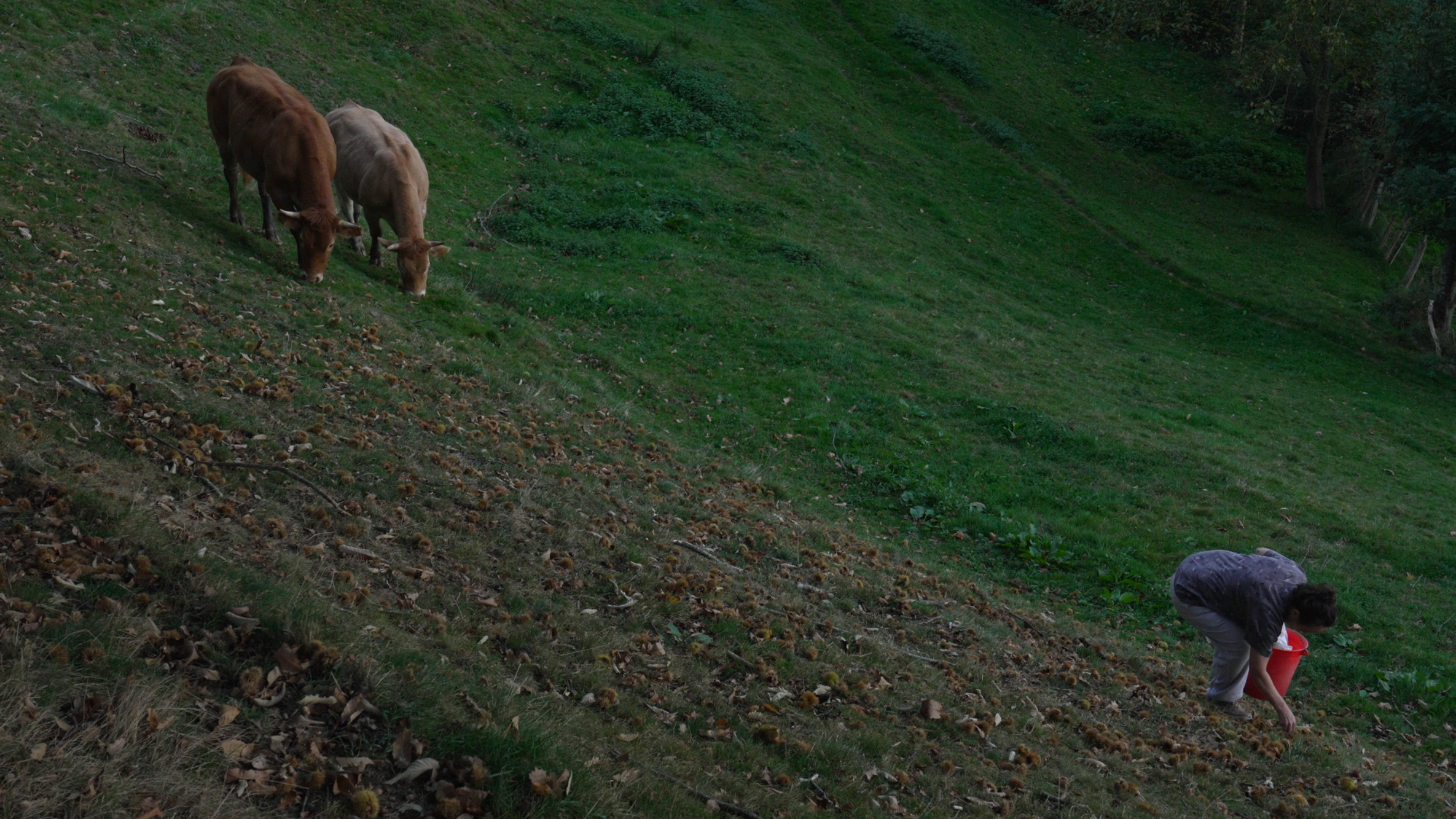 Un prado, cortado en dos triángulos. En el superior, hierba; en el inferior, hojas, ramas y zurrones de castañas que manchan el verde con tonos marrones. En la línea divisoria, una mujer recoge castañas mientras dos vacas la persiguen. Recuerdan a los pájaros que borraban el rastro de migajas de Hansel y Gretel, aunque esta vez revisan si hay alguna castaña que a la mujer se le haya podido escapar. Las líneas dirigen la vista hacia la mujer, que, mediante el color, parece ajena a la imagen, como si sobrara. Tal vez ella —que en el momento de la fotografía se enfadó con los animales por la escasez de castañas con la que se topó— consiguió la misma reacción en la naturaleza.