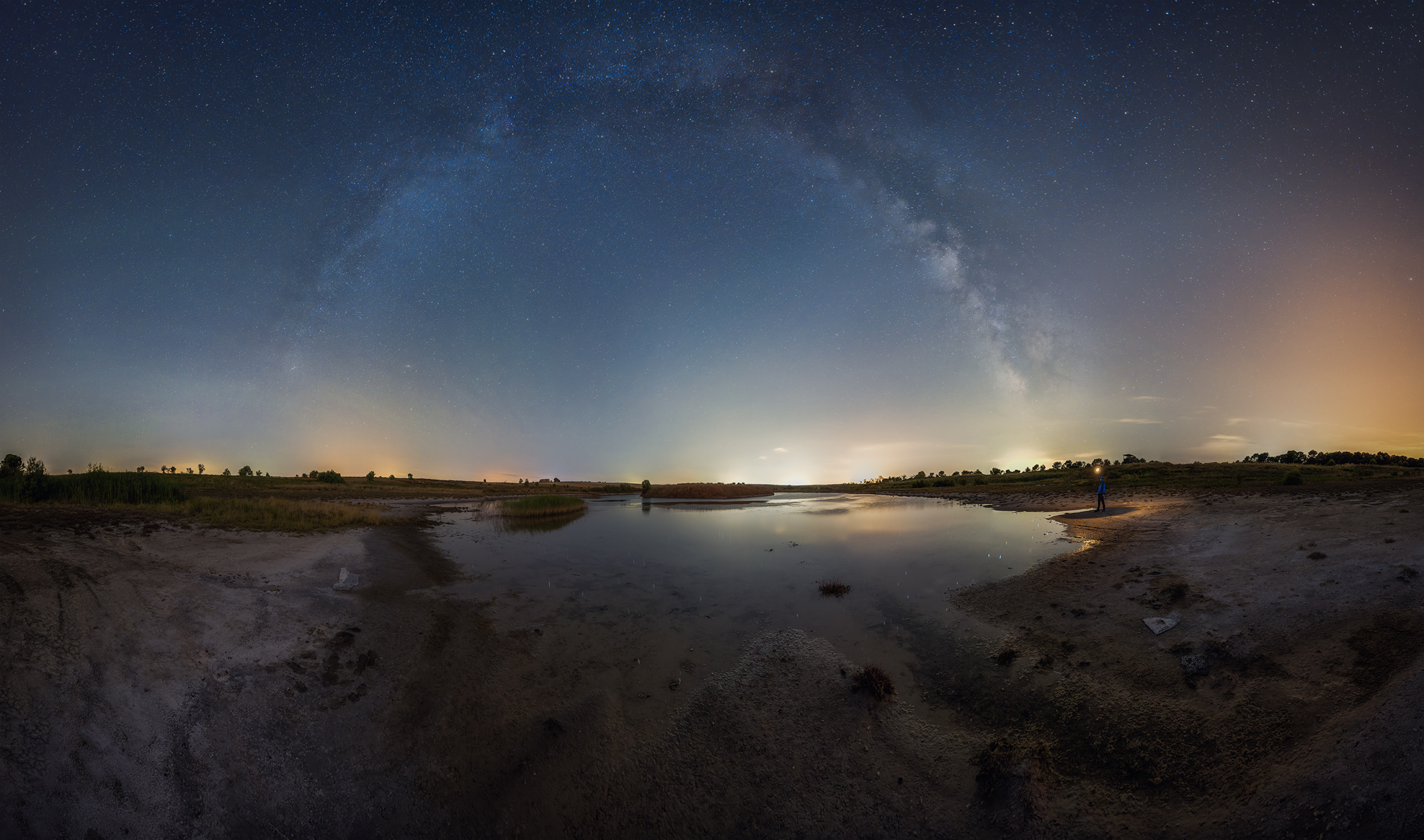 Fotografía tomada en la laguna de Lodosa bajo un cielo estrellado donde destaca la Vía Láctea.