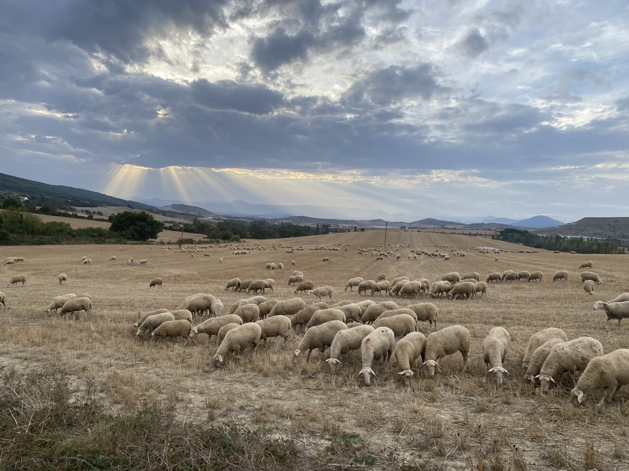 Rebaño disperso de ovejas comiendo en un campo cosechado del valle de Aranguren, al fondo está Pamplona.