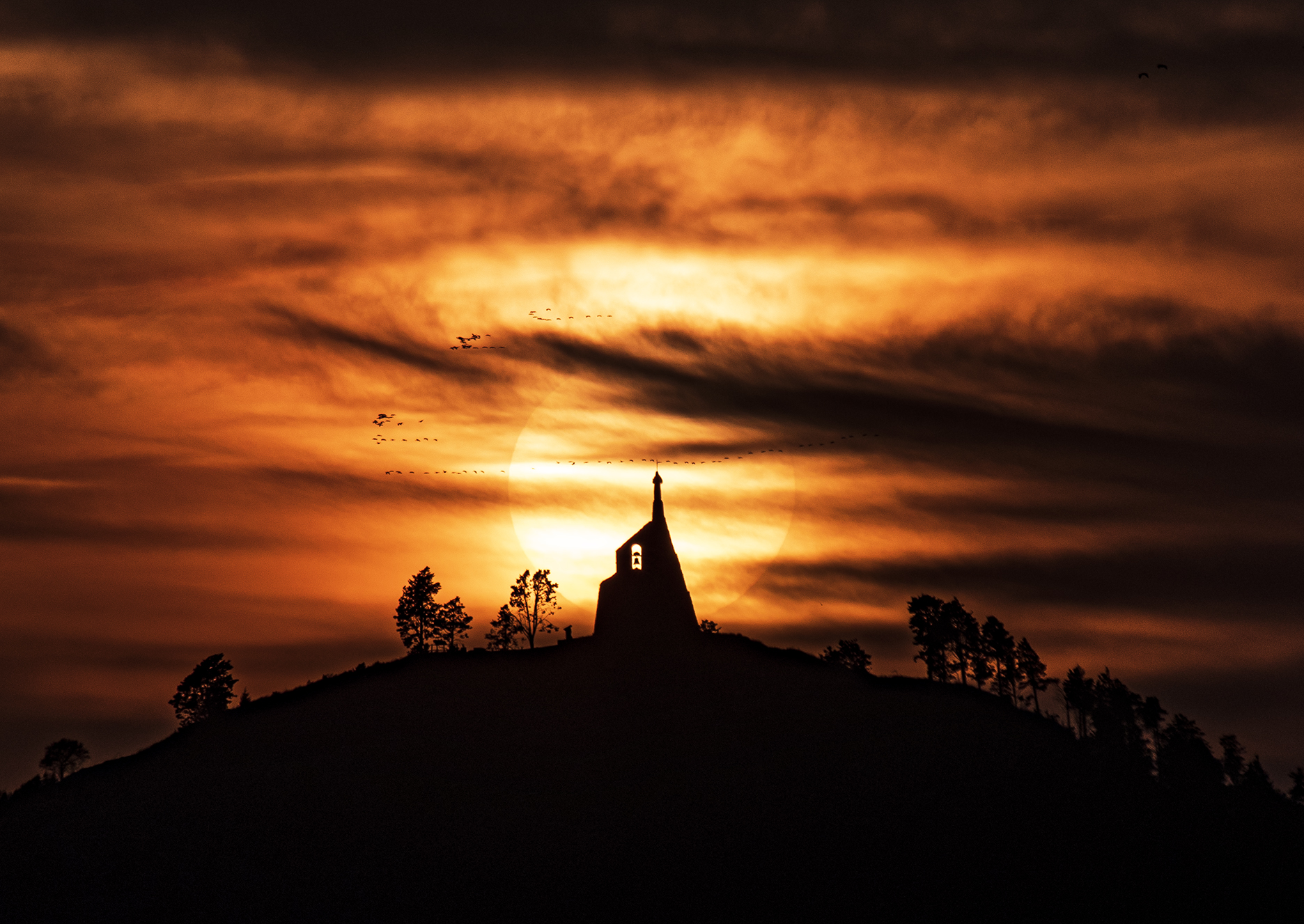 Pasa de grullas a contra luz Concurso: Paisajes y patrimonio https://concursos.diariodenavarra.es/conocer-navarra-2025/?p=25735 Grupo de grullas pasando sobre la Ermita de San Martín de Añorbe coincidiendo con la puesta de sol