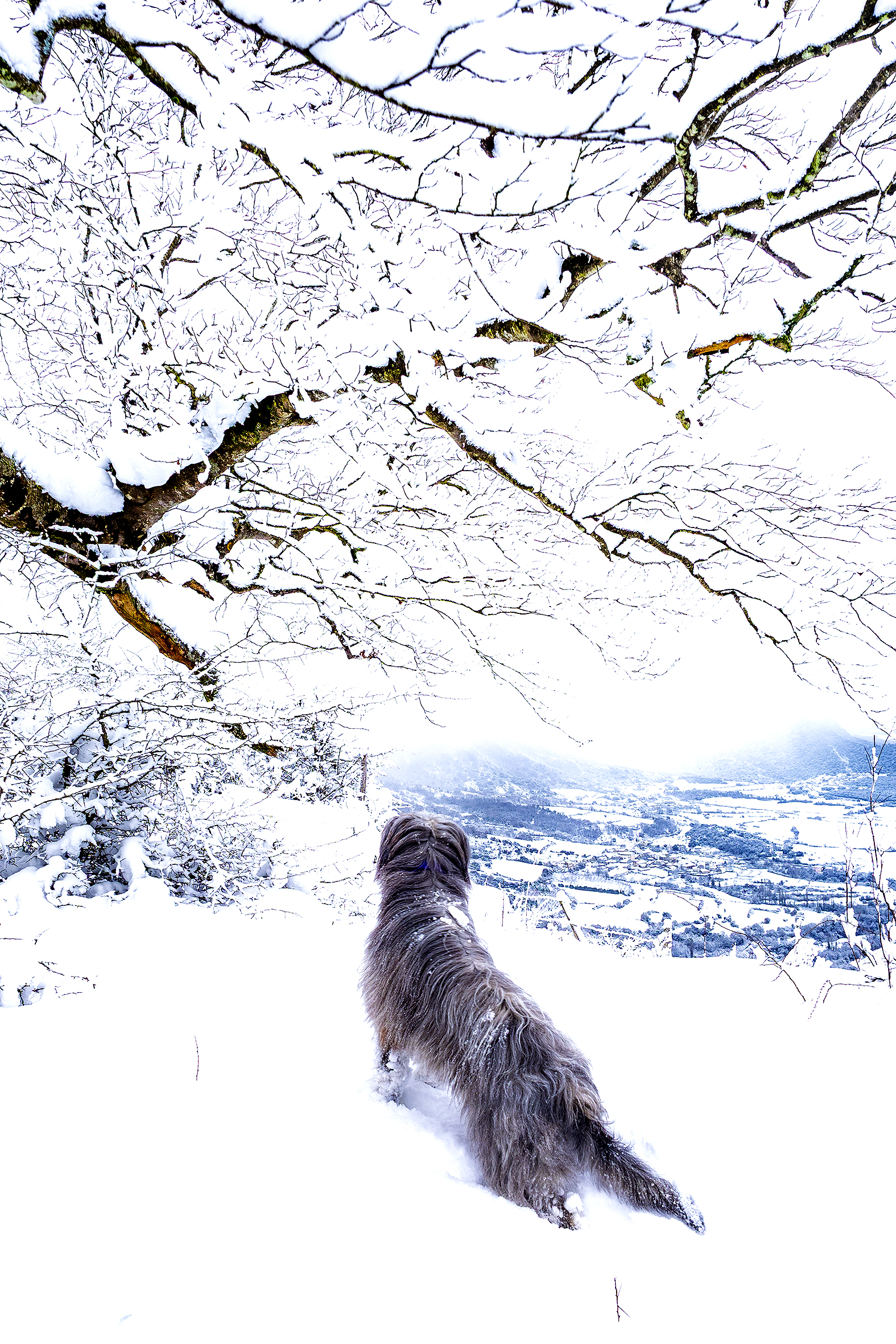 En una excursión a primera hora de la mañana en el entorno del Mirador de Ubaba (Balcón de Pilatos) a primeros de enero aproveché un fugaz momento en que mi perra se asomó sobre la vista al Valle de la Améscoa Baja para tomar esta foto.