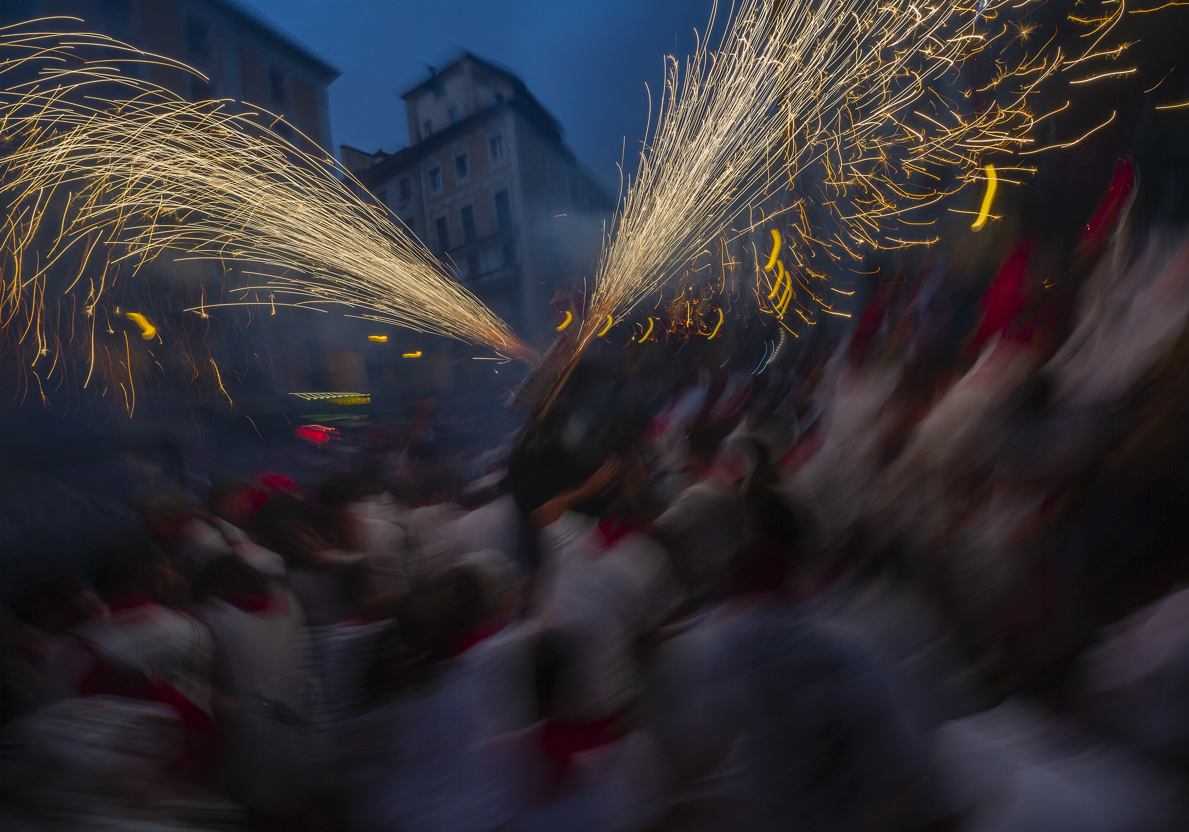 El toro de fuego, pasa por la plaza del ayuntamiento seguido de una multitud de personas, que le acompañan en su recorrido….