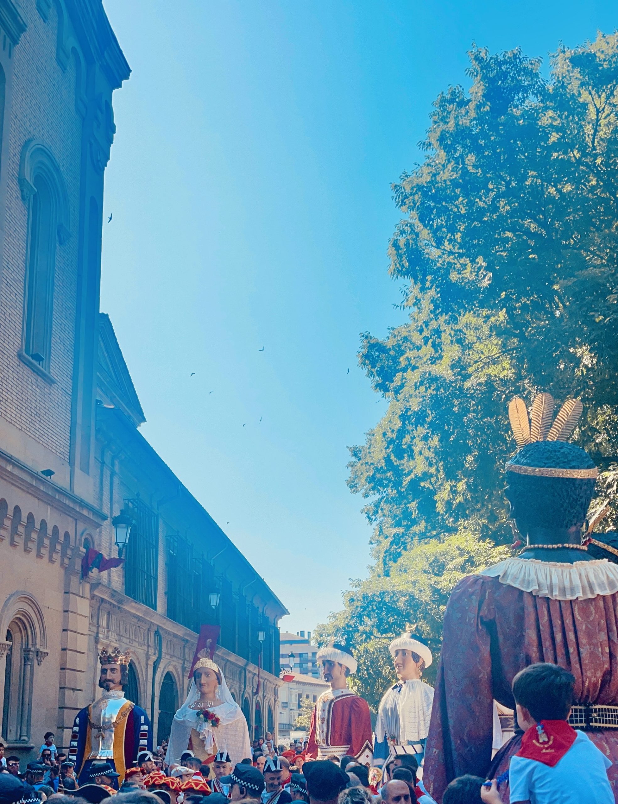 En el último día de las fiestas, los Gigantes de Pamplona acuden a la octava de San Lorenzo para despedirse de San Fermín bajo la atenta mirada de un niño