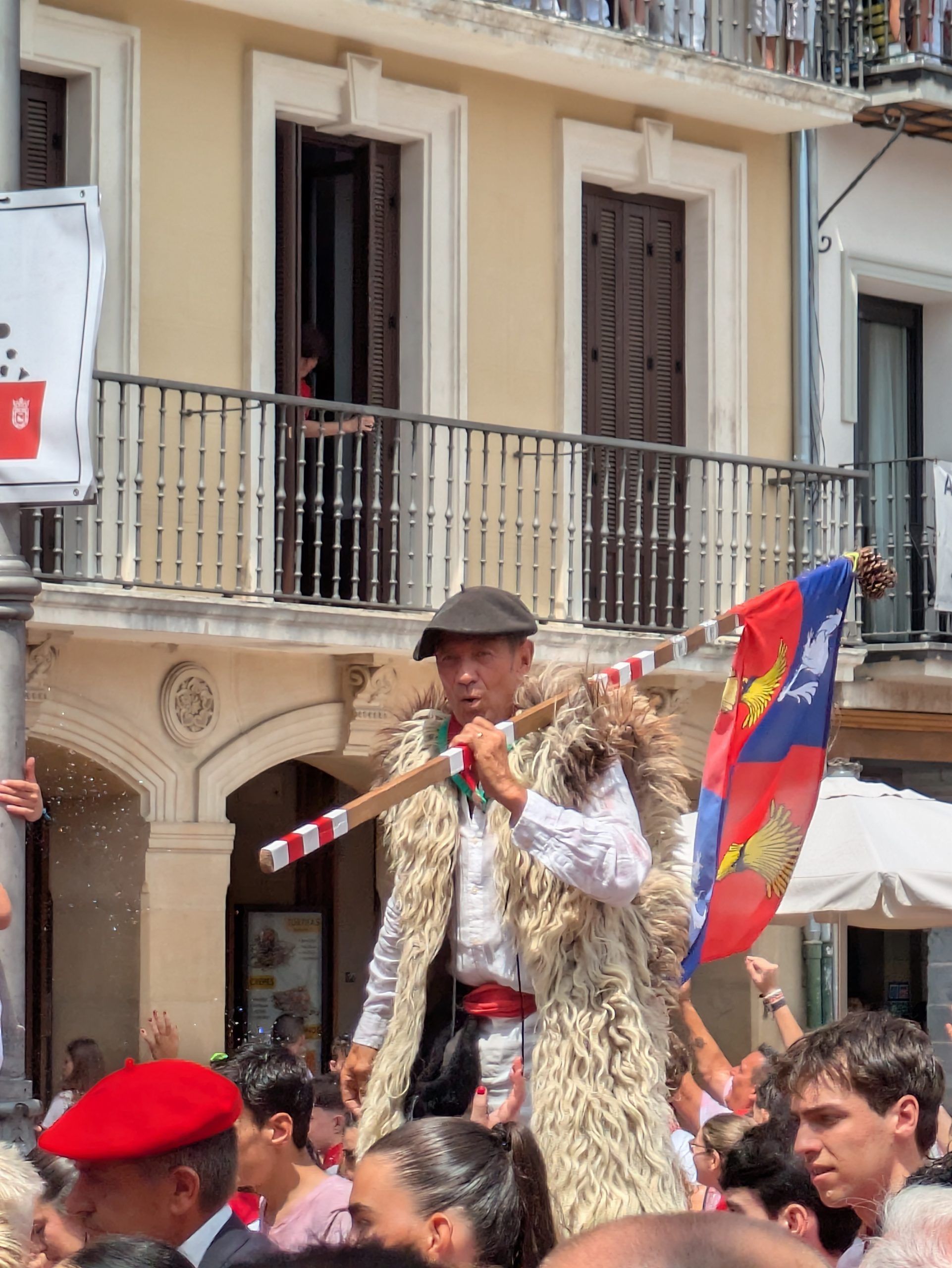 Se ve un hombrea con el traje típico de San Fermín cubierto por chaleco de lana de oveja y una boina negra típica del Pais Vasco y Navarra.