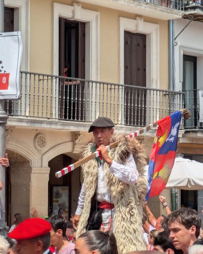 Se ve un hombrea con el traje típico de San Fermín cubierto por chaleco de lana de oveja y una boi