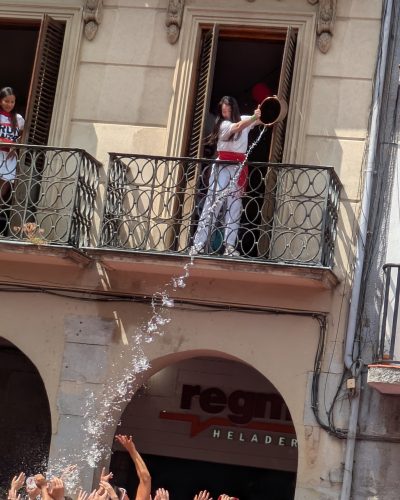Se presenta una mujer vertiendo agua de un jarrón desde un balcón en la Plaza del Castillo. Los he
