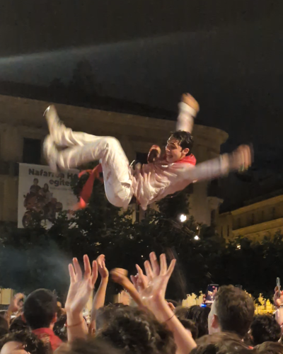 Esta imagen es de un chico manteado por su grupo de amigos en la primera noche de las fiestas de San